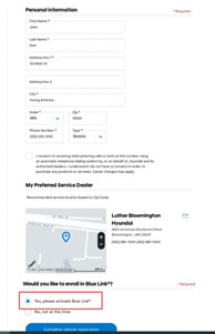 6. Enter in the details required for vehicle registration. Make sure to select “Yes, please activate Blue Link” under “Would you like to enroll in Blue Link.
